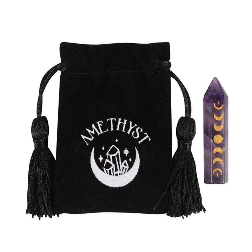 This beautiful amethyst crystal point is perfect in size for travel altars, desk decor or taking on the go for extra protection. Features a gold-tone moon phase engraving and comes with a matching drawstring bag for storage and safe-keeping.