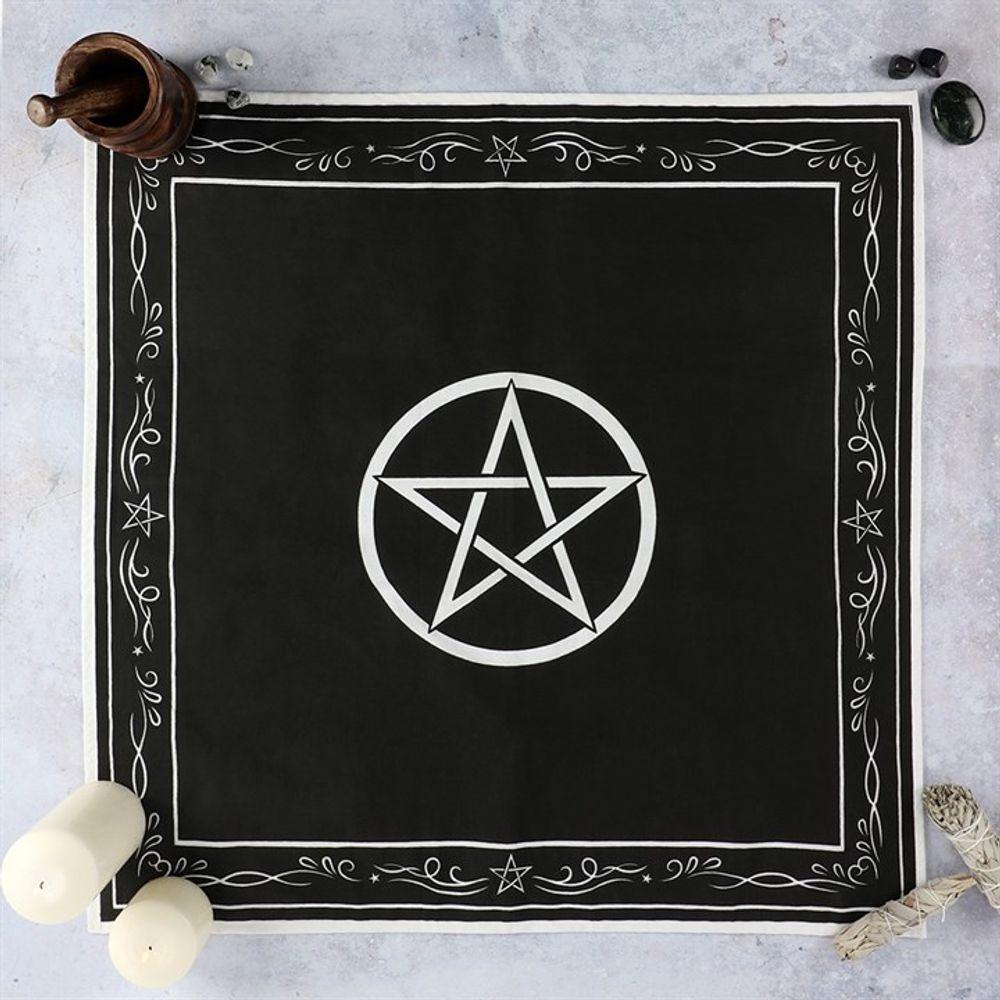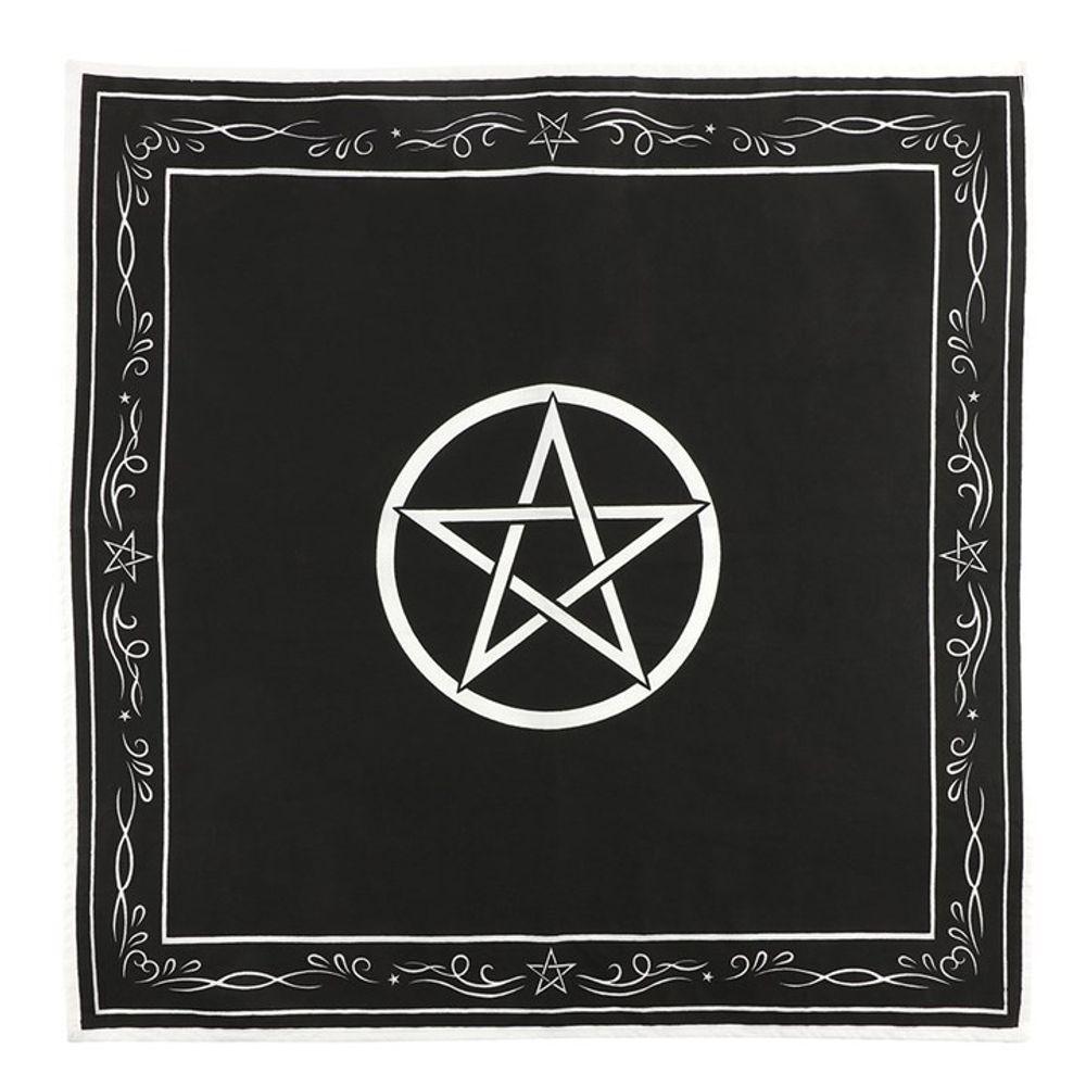 Decorate a sacred space with this black cotton altar cloth featuring a white pentagram design. The pentagram is a symbol found throughout many cultures and religions around the world and is widely believed to represent the five elements; earth, fire, water, air and spirit.