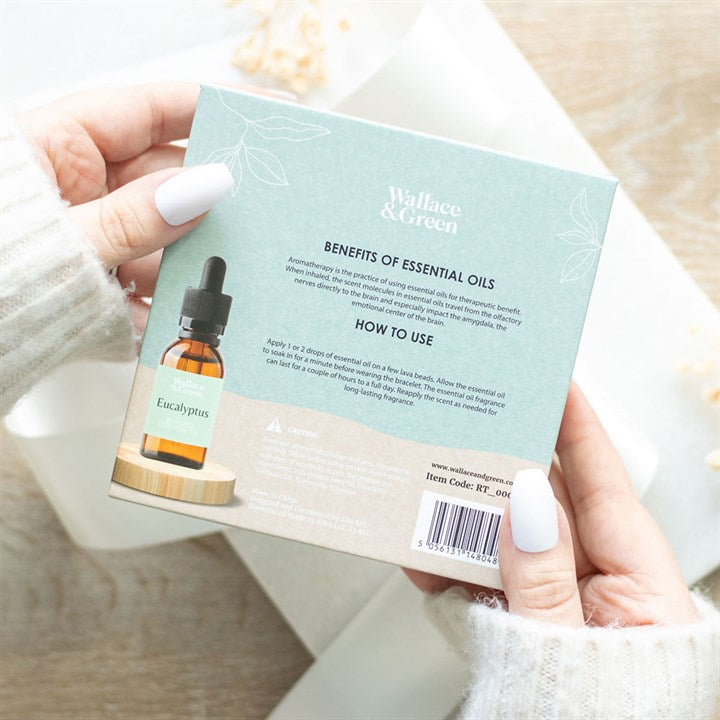 Crafted with natural amazonite and lava beads, the bracelet serves as a diffuser for the included eucalyptus oil, promoting calm and clarity.