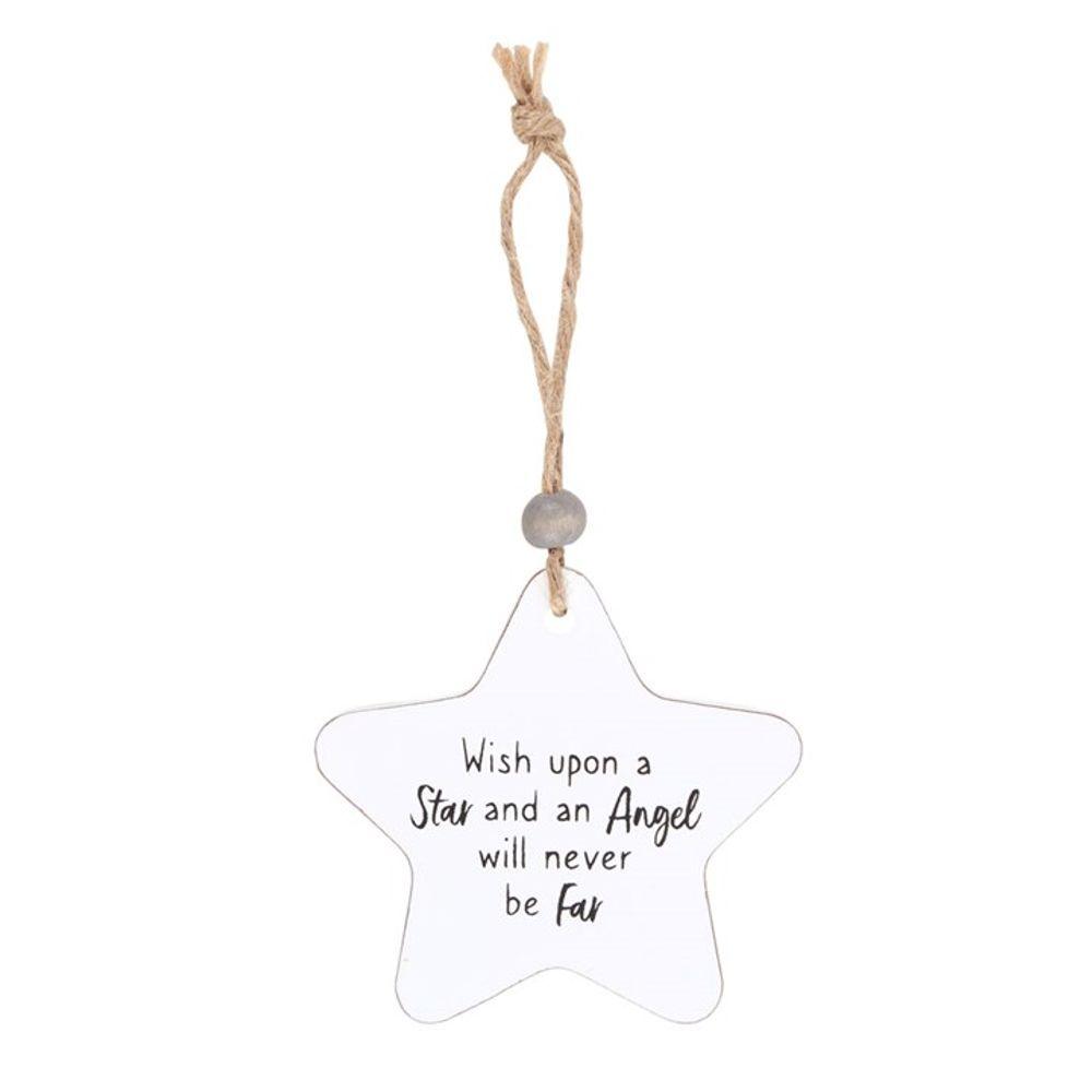 Features text that reads, 'Wish upon a star and an angel will never be far' and finished with a wooden bead.