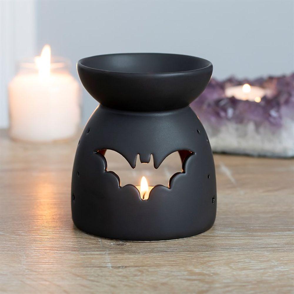 This black ceramic oil burner features a cutout bat design and a cool, matt finish. Compatible with both fragrance oil and wax and perfect for Halloween or spooky decor!