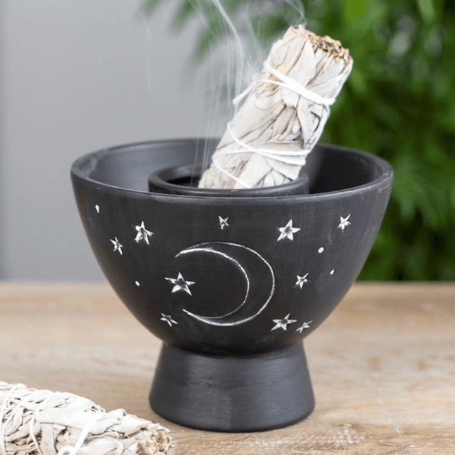 This black terracotta smudge bowl is detailed with a stunning crescent moon and stars design. Smudge bowls are used for burning herbs or holding lit smudge sticks whilst they burn. Product Dimensions: H10.5cm x W13cm x D13cm Packaged Dimensions: H14cm x W16cm x D16cm