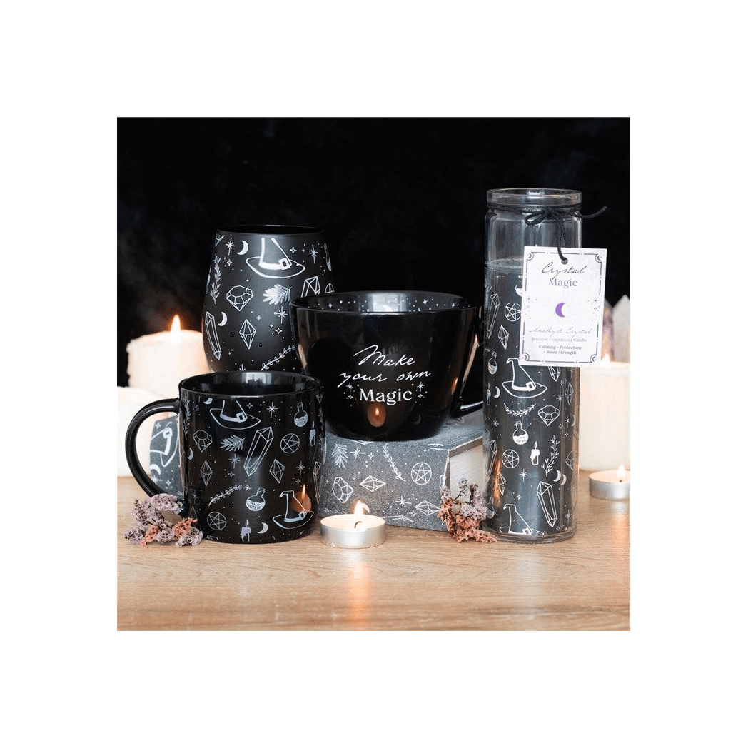 This vegan candle is decorated with a mystical design featuring crystals, witch hats and potions, making it a perfect gift for crystal collectors and witchcraft enthusiasts.