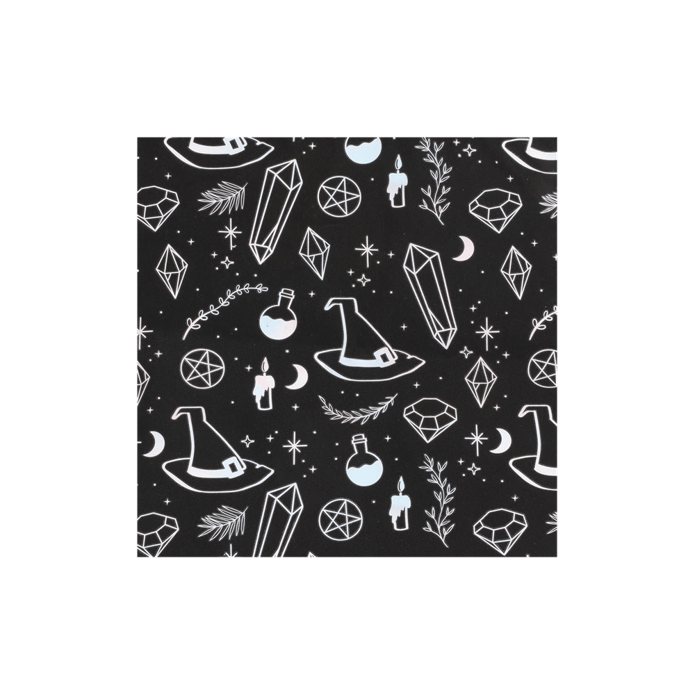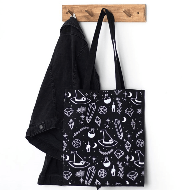 This trendy Polycotton tote bag is a fun and unique gift for any crystal collector or for anyone to stay in touch with their witchy side. Adorned with designs of crystals, witch hats and potions on a black Polycotton canvas.