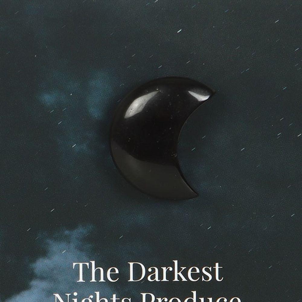 Give the gift of magic with this meaningful crystal greeting card. Includes a small black obsidian crescent moon attached to a greeting card with 'The darkest nights produce the brightest stars’ text. Black obsidian is a spiritual stone used for protection, grounding, and creating a calming atmosphere. Card left blank inside. Envelope included.