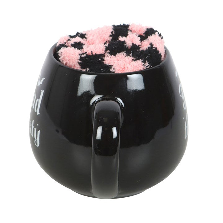 Stay cosy with this playful ceramic mug and socks set, featuring a “Dead Thirsty” slogan and a fun pink and black gothic design. Ideal for gifting, this set is perfect for tea lovers who appreciate a quirky touch. 500ml. Microwave and dishwasher safe.