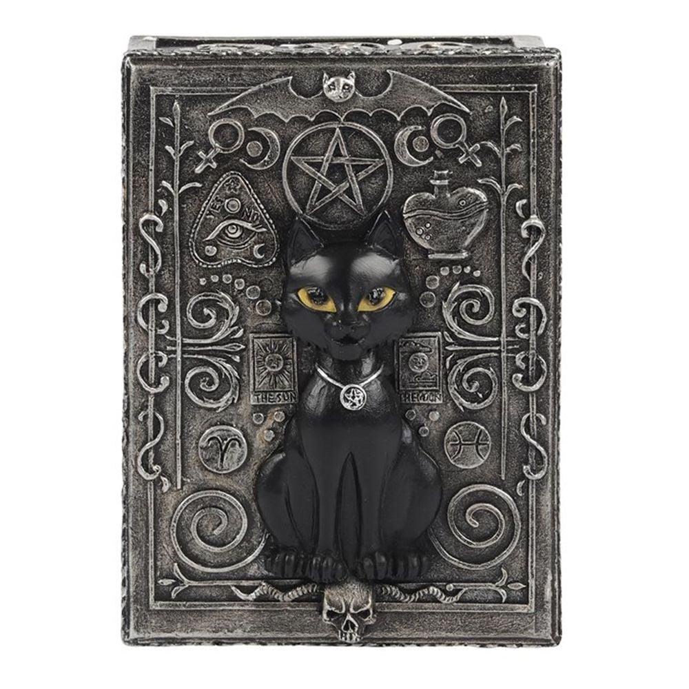 A resin box with raised silver pentagram, tarot card, astrological and bat details and a black cat in the centre. This gothic style is perfect for holding small tarot card decks, crystals, herbs and other small objects for safekeeping Inner storage space measures approximately 8cm x 12cm x 3cm.