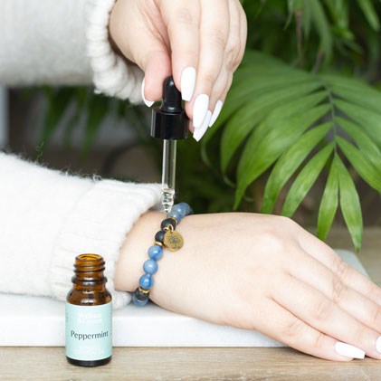 Crafted with natural blue lace agate and lava beads, the bracelet serves as a diffuser for the included peppermint oil, promoting stress reduction and boosting energy.