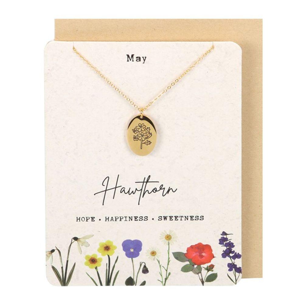 This lovely greeting card features a timeless wildflower design and holds a gold-tone necklace adorned with the recipient's birth flower, making it a thoughtful surprise for birthdays, Mother's Day, milestone moments and more. Symbolising hope, happiness and sweetness, the hawthorn flower is a meaningful token for those born in the month of May. Includes engraved flower charm on a 22cm nickel-free chain. Card left blank inside. Envelope included.