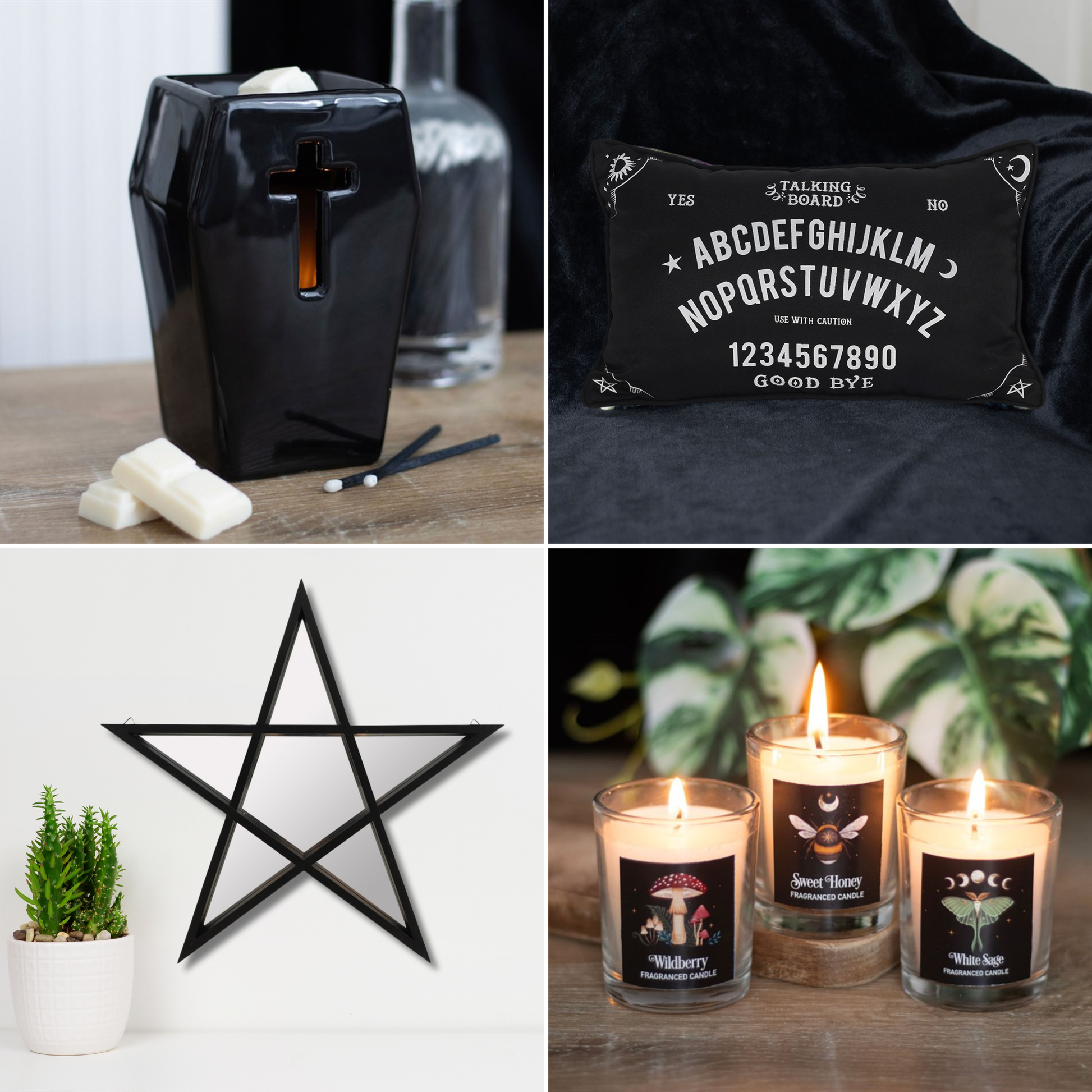 • Framed Pentagram mirror: This black pentagram design is a bold statement piece for decorating the home with an alternative theme. Size: H38.5cm x W40.7cm x D3cm