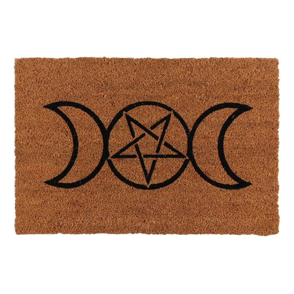 A natural coir doormat with printed Triple Moon design. The Triple Moon is a popular symbol representing the Triple Goddess and is characterised by a waxing, full and waning moon. Design may fade in extreme weather. Suggested for sheltered and indoor use only.