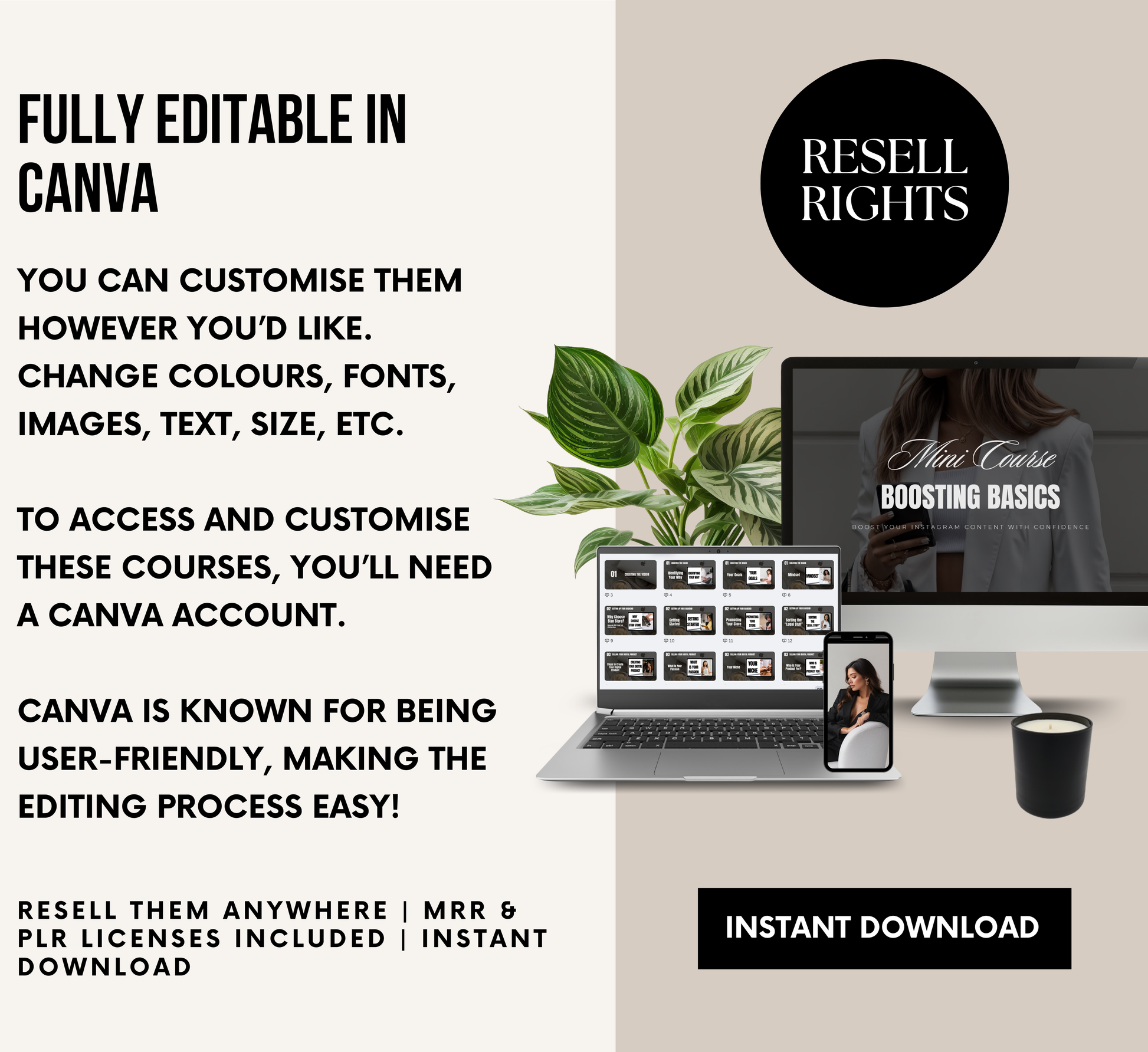 Fully editable in Canva, these 12 mini courses come with Master Resell Rights (MRR) + Private Label Rights (PLR) — meaning you can use it for personal growth OR rebrand and resell it as your own product for 100% profit 💸 You can also pass on PLR/MRR rights to your customers! 🎉