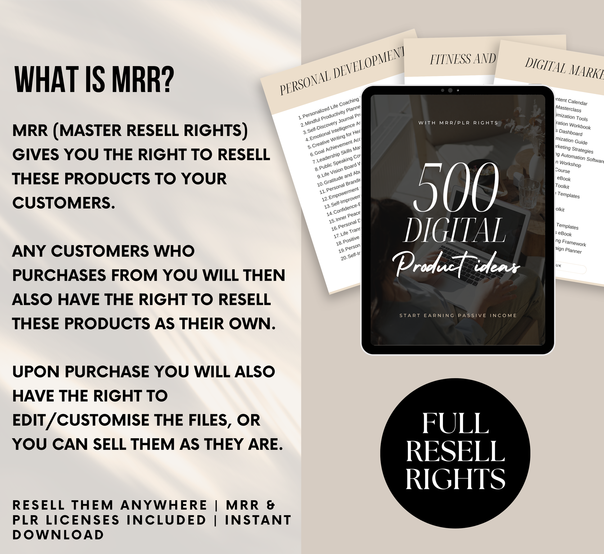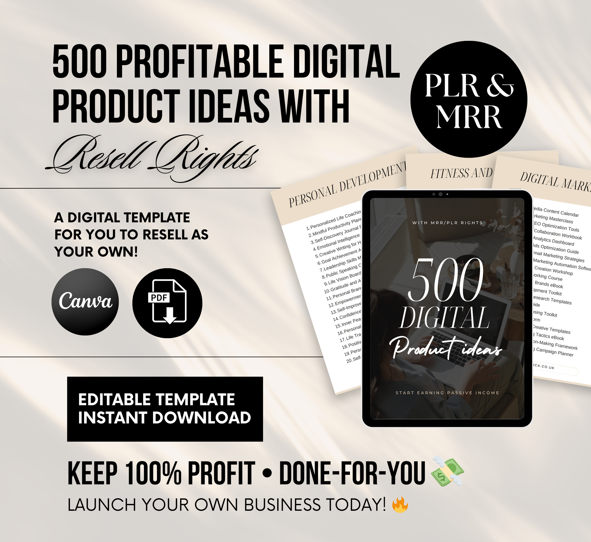 ✨ 500 Digital Product Ideas Guide + 🎁 30 Bonus Faceless Reels | Editable Canva Template with PLR + MRR Resale Rights