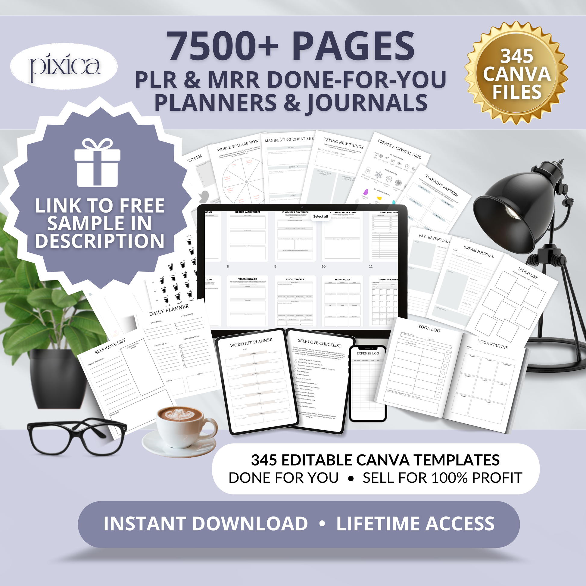 💫 Included are 7500+ page done-for-you digital planners, journals and trackers – 345 Canva products with Private Label Rights (PLR) & Master Resell Rights (MRR)