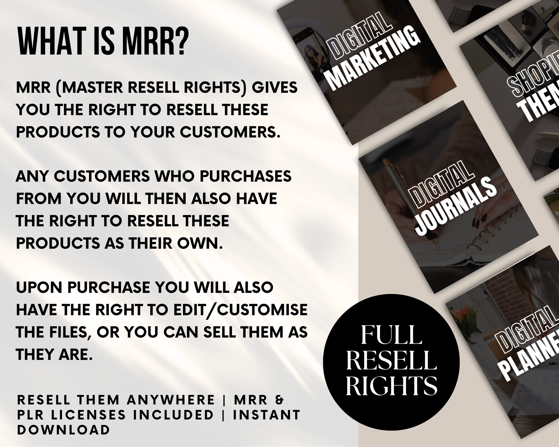 👉 PLUS - every single digital product comes with Master Resell Rights (MRR) & Private Label Rights (PLR) - which grants you the exclusive rights to resell to others and pass on resale rights to your customers, keeping 100% of the profits for yourself!