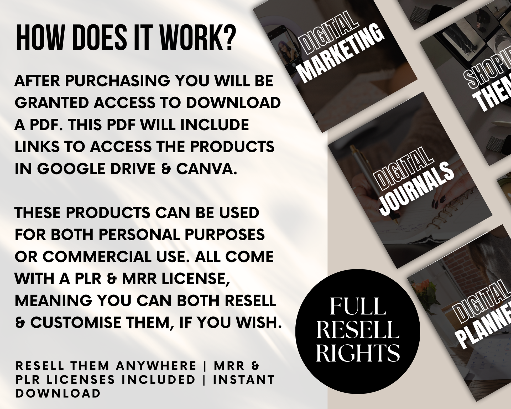 You can instantly download & use these digital products however you wish - Ebooks, Planners, Posters, Journals, T-shirts, Cards, Shopify websites, Social Media Images, Guides, as part of a Membership, as part of a Course, Ebook Bundle, Print on Demand, Personal Use, Business Use, Resumes... the list of online business opportunities goes on!