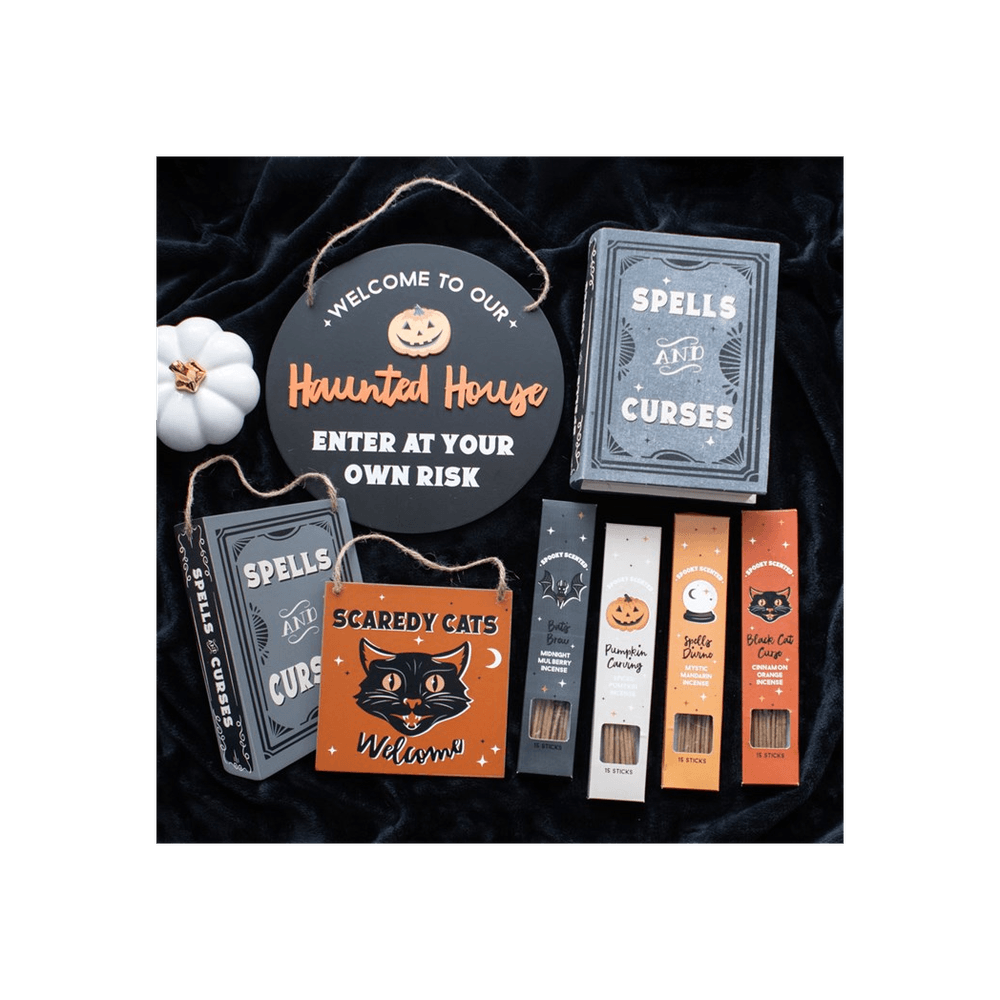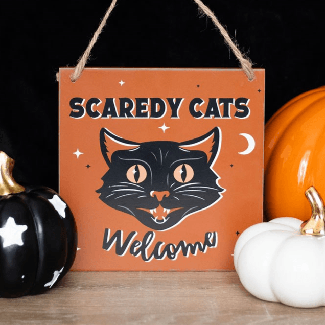 Decorate for the Halloween season with this vintage inspired hanging sign with a 'Scaredy Cats Welcome' design. Featuring a mysterious black cat on a bold orange background, it's an eyecatching piece which is perfect for helping to create a spooky atmosphere for the season.