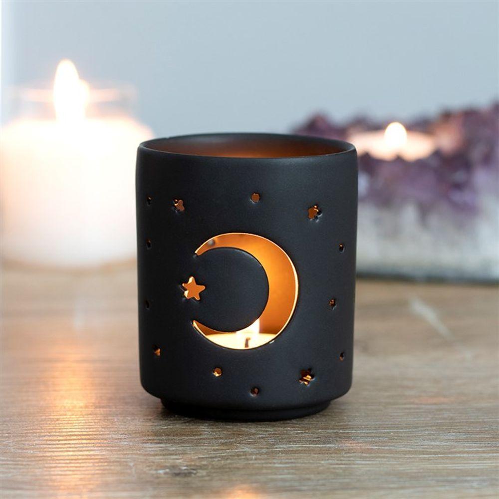 Place a tealight or small votive candle in this black candle holder to light up the moon and stars with a soft flickering glow. Product Dimensions: H7cm x W6cm x D6cm Packaged Dimensions: H9cm x W7.5cm x D7.5cm