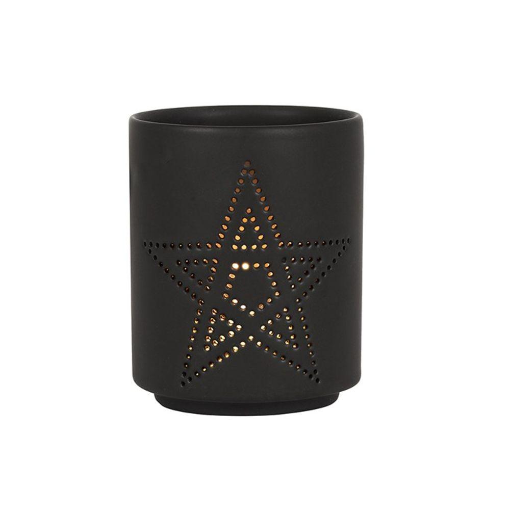 This ceramic tealight holder features a pentagram design in a cool, matt black finish. Perfect for festive Halloween decor or a spooky feel all year long. Holds one standard tealight candle. Product Dimensions: H7cm x W6cm x D6cm Packaged Dimensions: H7.5cm x W7.5cm x D9.5cm