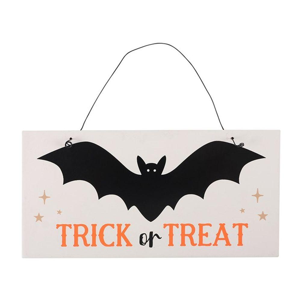 Hanging bat 'trick or treat' sign perfect for decorating at Halloween. Hang by itself on a door or make a feature wall with a selection of other Halloween signs and decorations.