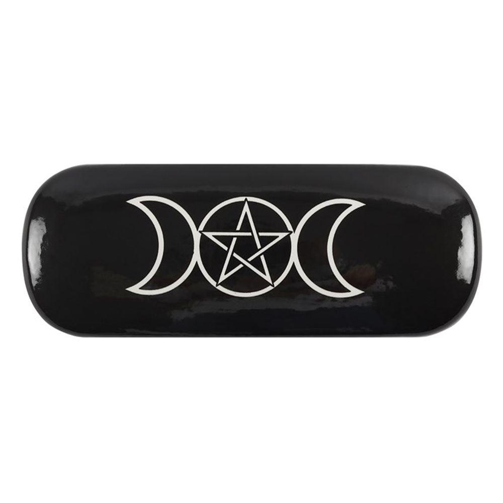 A black glasses case with simple, white Triple Moon and pentagram design. The case also comes with a handy cloth for cleaning glasses.