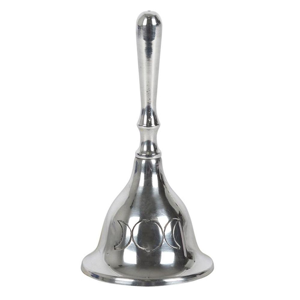 Clear unwanted energies with this puja bell with a handcarved triple moon design. Perfect for rituals at a sacred altar. Made from brass.
