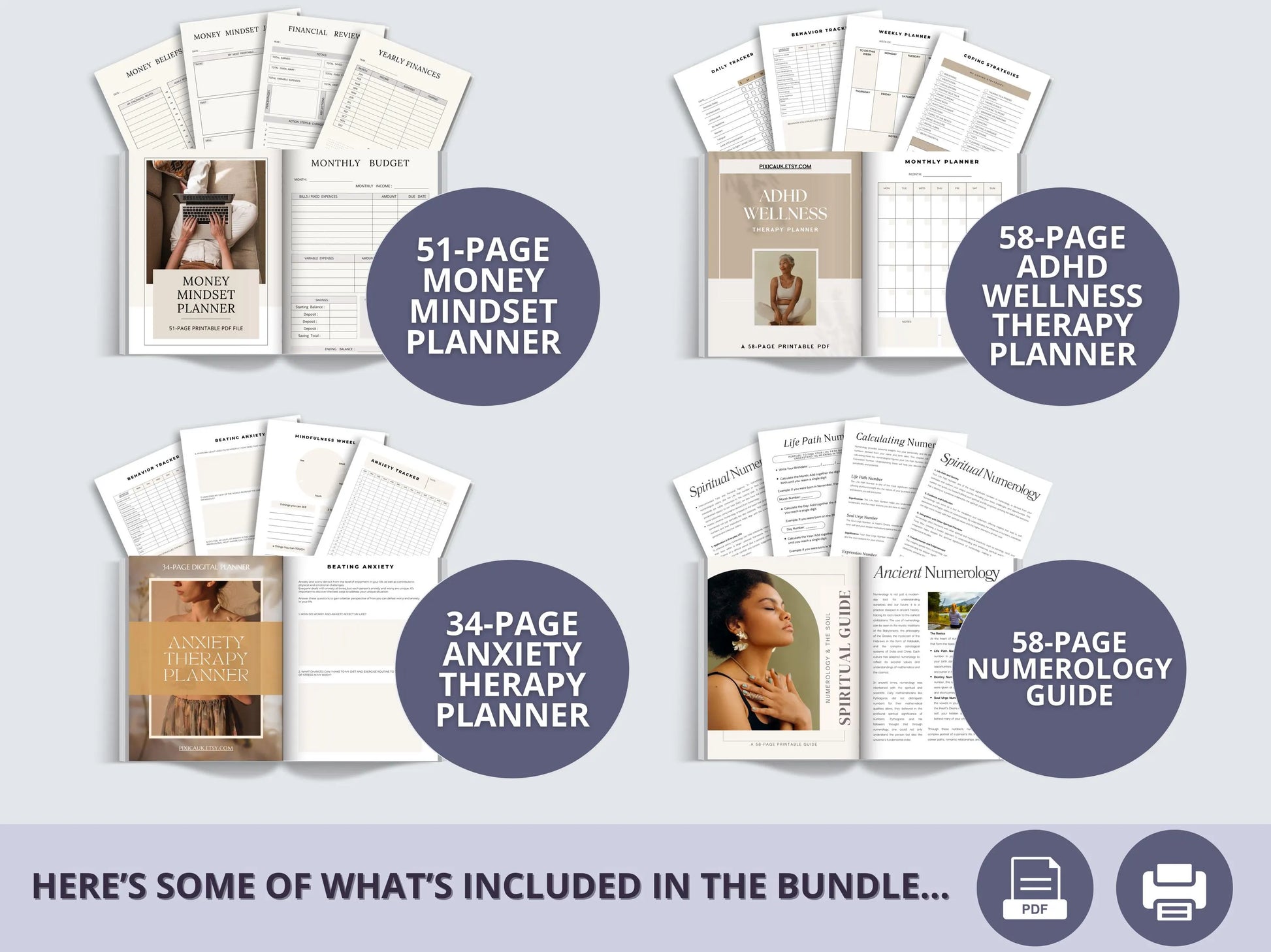 It’s a complete library of 80+ thoughtfully designed PDF ebooks, planners, journals, and spiritual workbooks — all created to help you: