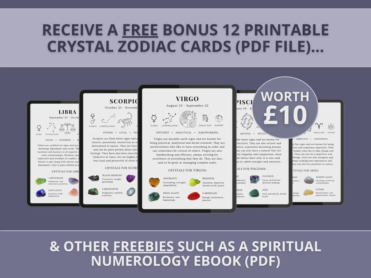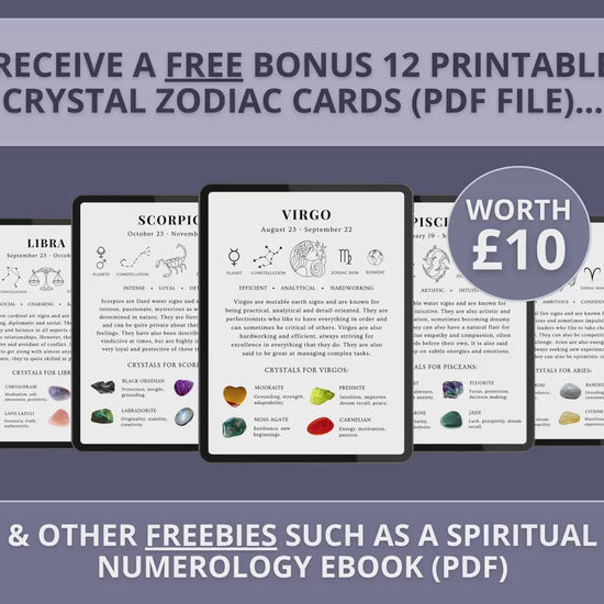 - 6 BONUS FREEBIES (such as 12 printable zodiac crystal cards worth £10)